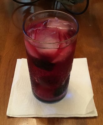 Cranberry-Pomegranate juice and Seltzer water. Garnished with Black berries and strawberries.