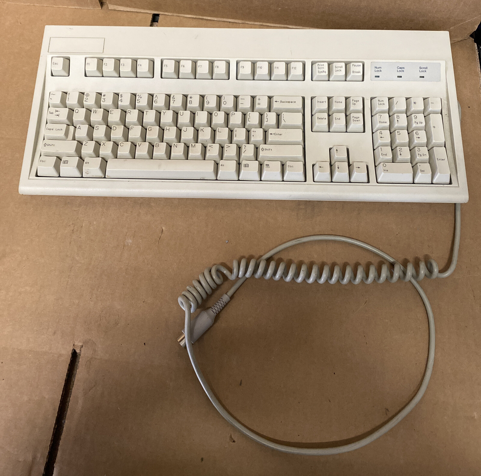 I need help finding a white machanical keyboard that I owned between 2001 and 2009. I want to know which brand and model it was. It looked exactly like the keyboard in these images. It had a hard white plastic case, a white wrist rest, a five pin DIN connector exactly like the one in the image with a telephone coil like wire and keys that made a clicking sound while typing. The back of the keyboard was also in hard white plastic. You can see the brand and model number in these keyboard images but I am not sure which one I had. I do not know why but the connector of this keyboard in the images is also PS2. So can you please help me find the exact brand and model of the keyboard image that I have in my mind.