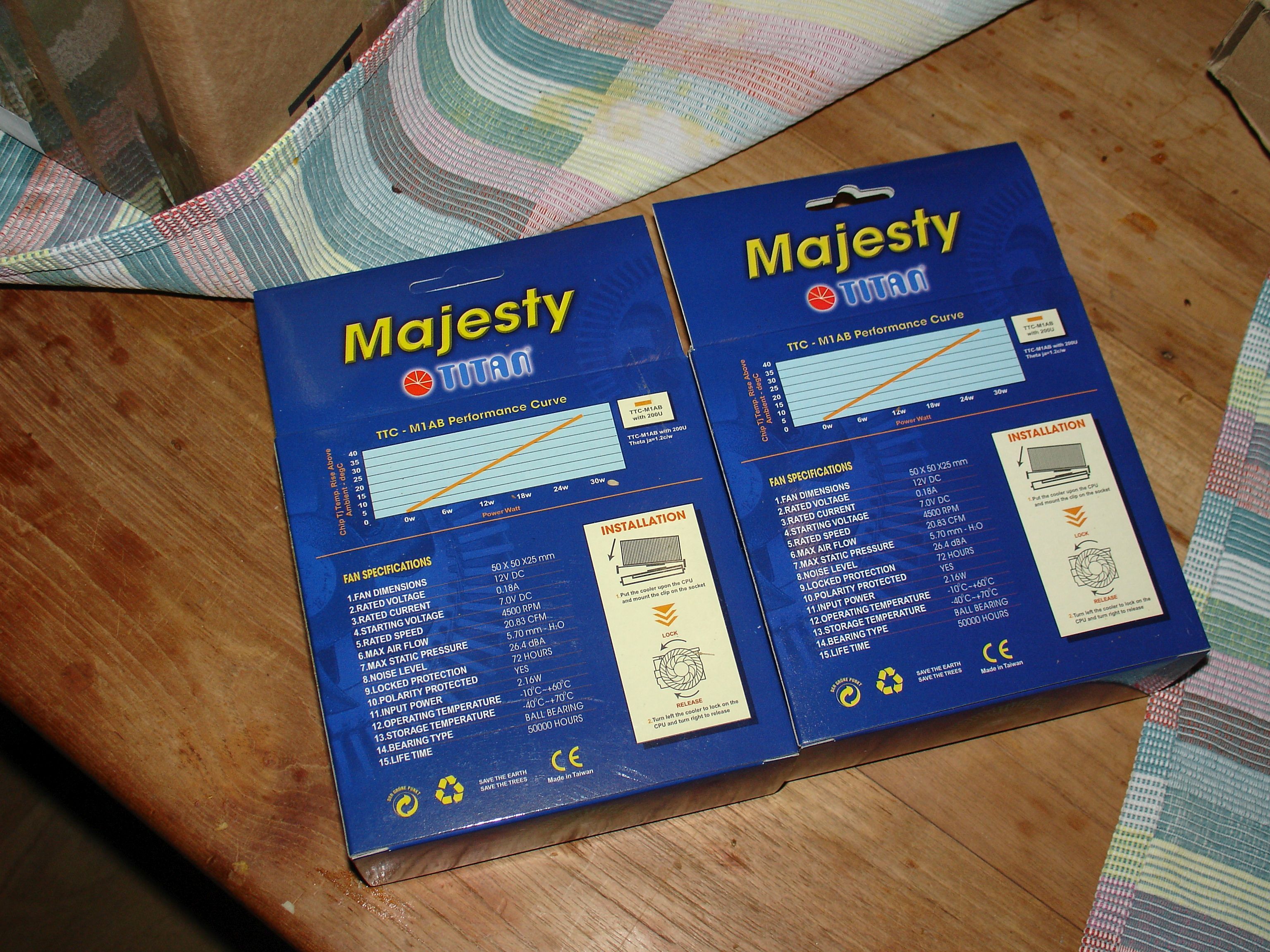 Then I thought to myself that it is never a bad thing to go too unprepared, thus grabbed two Intel Pentium 3/EB 1000 SL532R's from 2001 with a CPU Voltage of 1.75 v for 56 Eur from a guy in Germany and a pair new from old stock TITAN Majesty V< rebranded Thermaltake Golden Orbs for S370 from a guy in the Czech republic for 46 Eur, made sure I bought these for a rebuild of my first Duallie.