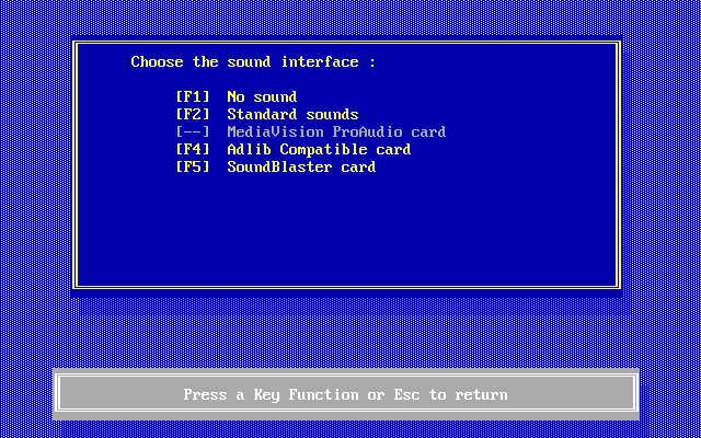 PC Speaker, Tandy 3-Voice, Adlib/Sound Blaster, and Roland MT-32 (the game asks which of those are installed)