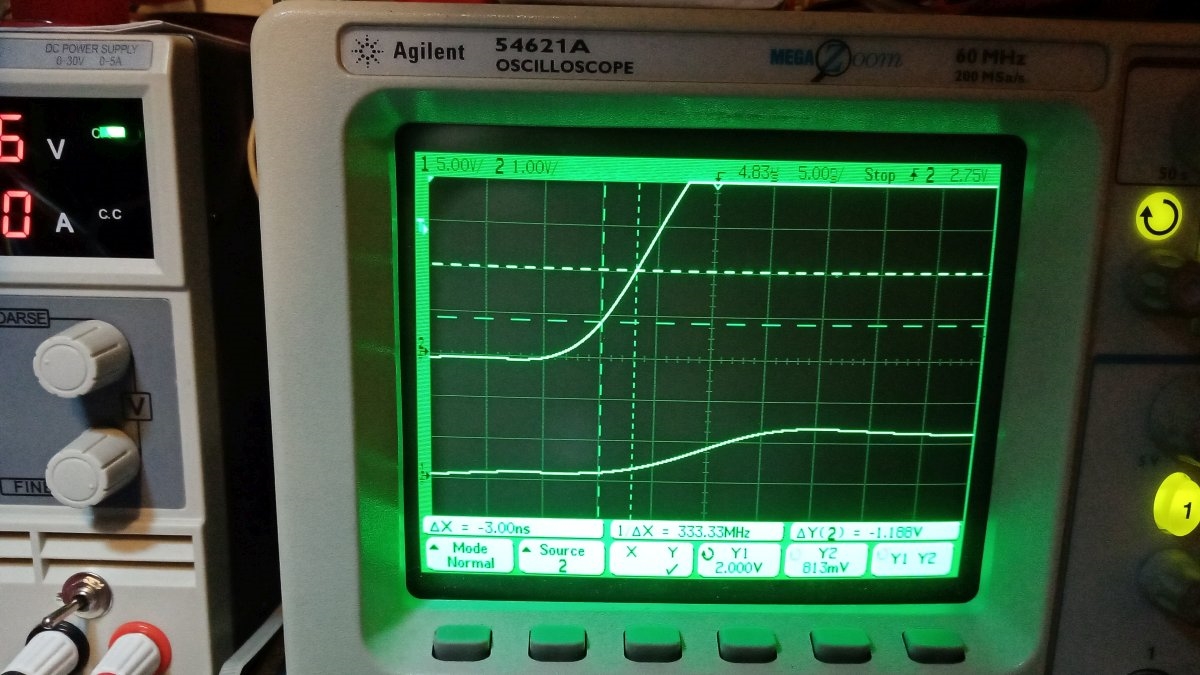 Next here is a zooming of the 8mhz clock : it's 3ns from 0.8 to 2V exactly matching the min spec !